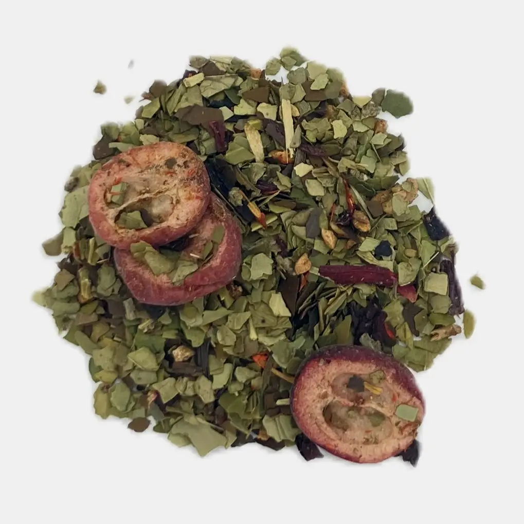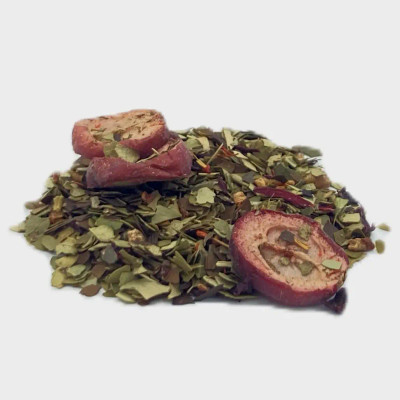 Ainesosat: vihreä mate (50 %), hibiscus, omenapalat, karpalot (karpalo, sokeri, auringonkukkaöljy) (10 %), paahdettu mate (10 %), luontainen aromi, makeat karhunvatukan lehdet, karpalo (2 %), saflorin kukka.