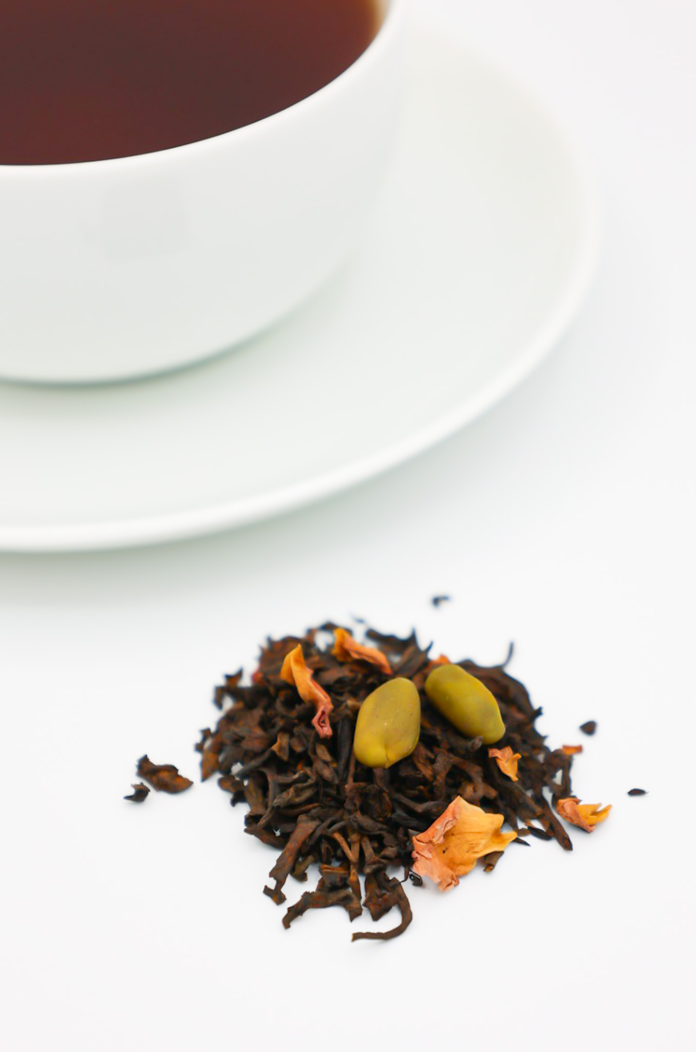 Ainesosat: Pu Erh tee (93 %), pistaasipähkinä, aromi, ruusun terälehdet.