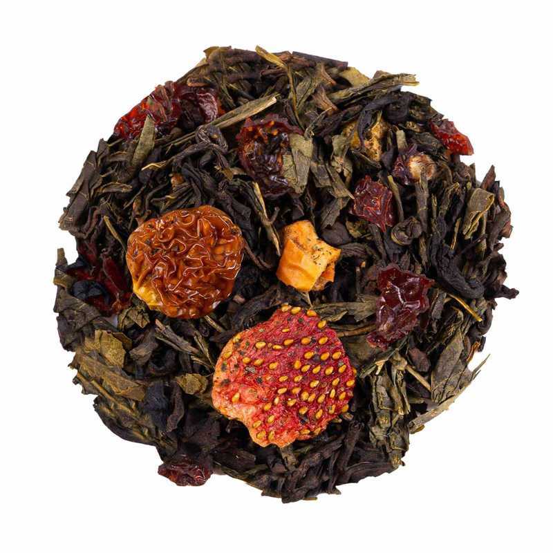 Ainesosat: Pu Erh (45 %), vihreä tee Kiinan Sencha, vihreä tee Kiinan Jasmiini, ruusunmarja, luontainen aromi, omena, mansikka, physalis, kiwi-viipaleet.