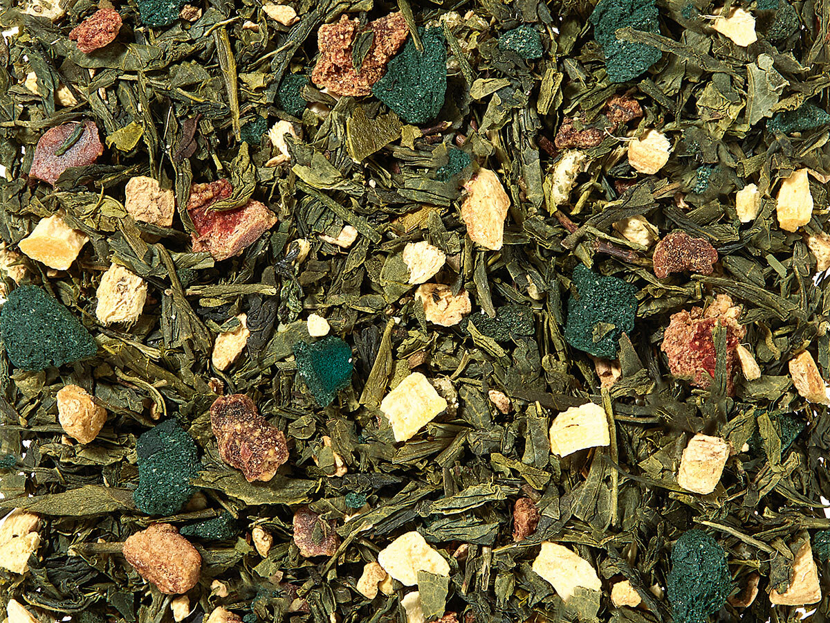 Ainesosat: vihreä tee (68 %), inkivääripalat, päärynäpalat, luontainen aromi, pakastekuivatut päärynäpalat, pakastekuivatut passionhedelmähiutaleet (glukoosisiirappi, tiivistetty passionhedelmämehu, aprikoosimassa, muunnettu tärkkelys, sakeuttamisaine: natriumalginaatti), pakastekuivattu omena-spirulina crunchy (omenasose tiivisteenä hapettumisenestoaineella: askorbiinihappo, spirulina platensis).