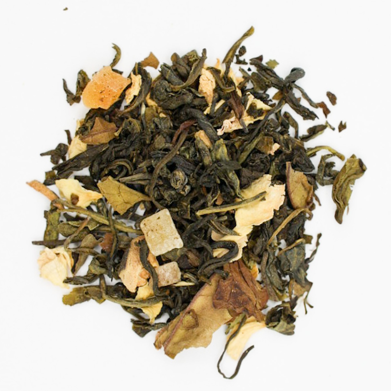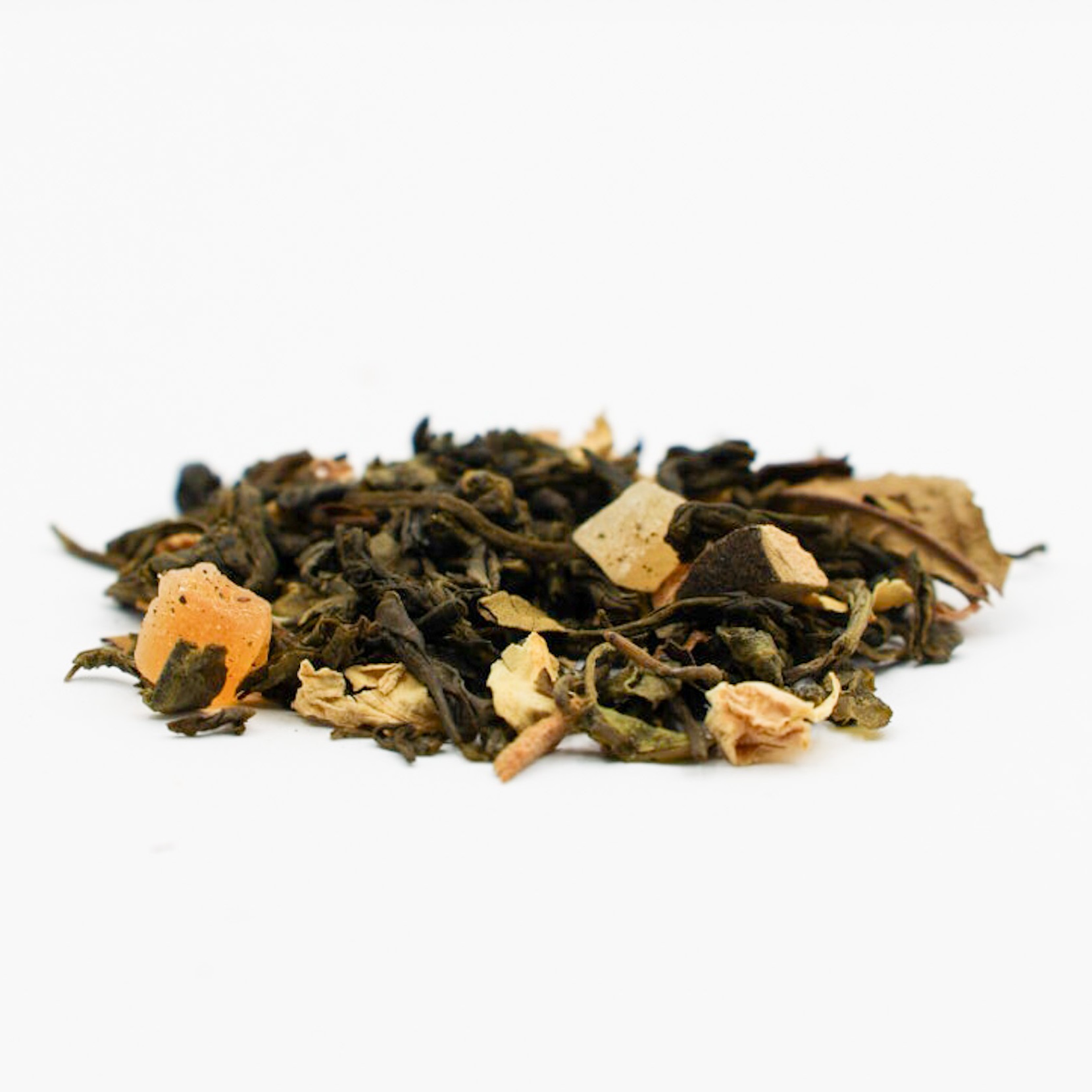 Ainesosat: valkoinen tee China Mao Feng, -Pai Mu Tan, sokeroitu papaijapala (papaija, sokeri), luonnollinen aromi, guavapalat (4%), ruusunkukat.